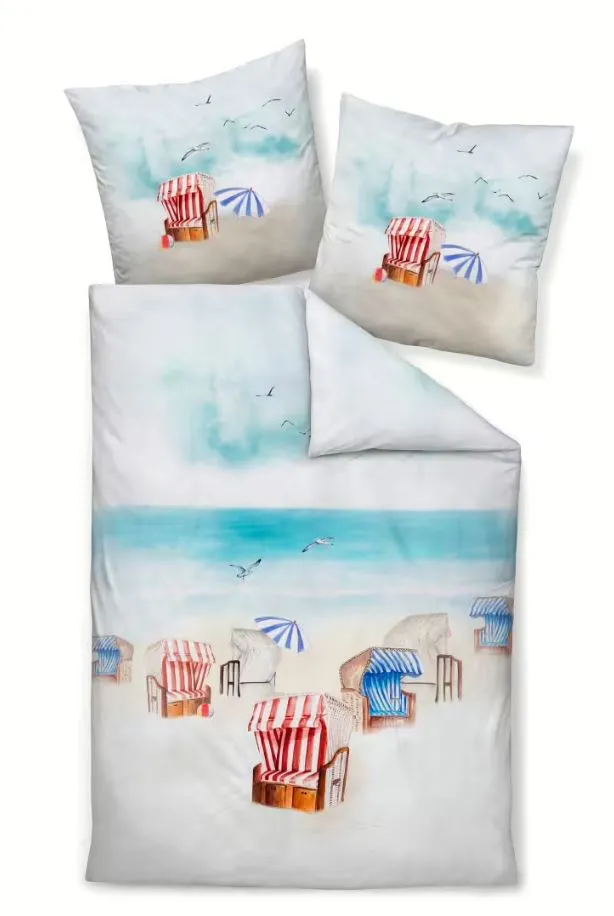 Die Mako-Satin Bettwäsche Modern Art S von Janine in Rot und Blau entführt Sie an einen entspannten Strand. Die leuchtend roten und blauen Strandkörbe stehen im Vordergrund, während die blaue See bis zum Horizont reicht. Möwen kreisen am Himmel und verleihen dem Design eine authentische Urlaubsatmosphäre. Hergestellt aus hochwertigem Mako-Satin, fühlt sich die Bettwäsche wunderbar weich und leicht auf der Haut an und sorgt für pure Entspannung. Atmungsaktiv und hautsympathisch, ist sie bei 60°C waschbar, bügelgeeignet und trocknergeeignet. Der praktische Reißverschluss ermöglicht ein einfaches Beziehen. Erhältlich bei Möbel Bernskötter in Mülheim an der Ruhr.