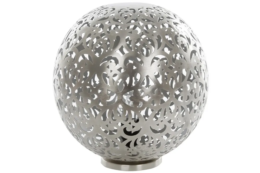 Eine Kugellampe im besonderen Design begeistert durch die aufwendige Oberfläche, die liebevoll im Herz-Ornamentstil kunstvoll gearbeitet wurde. Der Lichtschein durchdringt die unzähligen Löcher und gibt eine romantische Stimmung an die Umgebung ab. Egal wo Sie diese Kugellampe platzieren, ihr dezentes Licht verzaubert und bewundernde Blicke sind Ihnen sicher. Ein schmaler runder Sockel unter der Kugellampe sorgt für die nötige Standfestigkeit. Benötigt wird ein E27 Leuchtmittel mit maximal 40 Watt.
